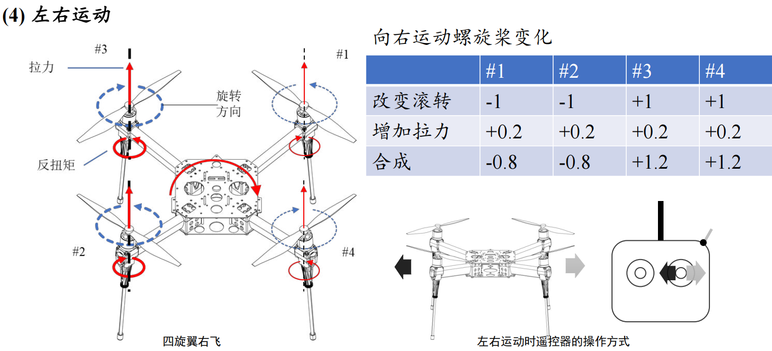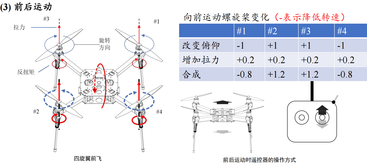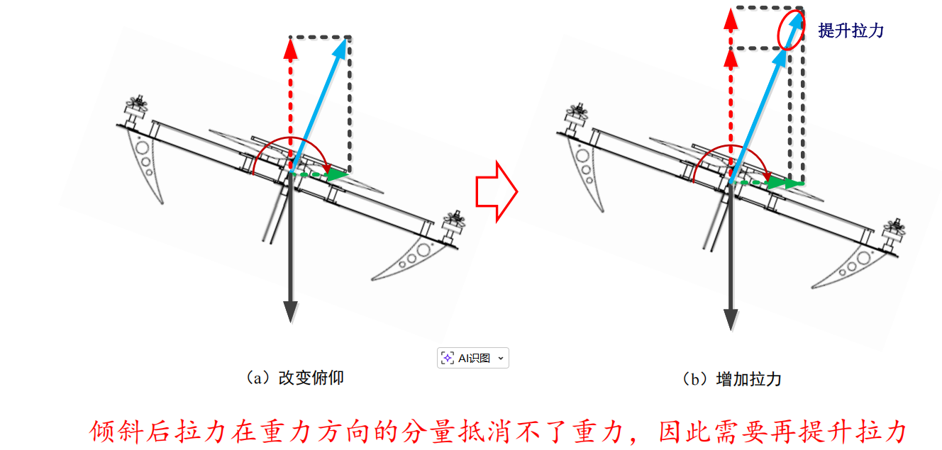 前后运动需要改变俯仰力矩,同时适当增加整体拉力,以弥补倾斜后拉力在重力方向分量的不足。