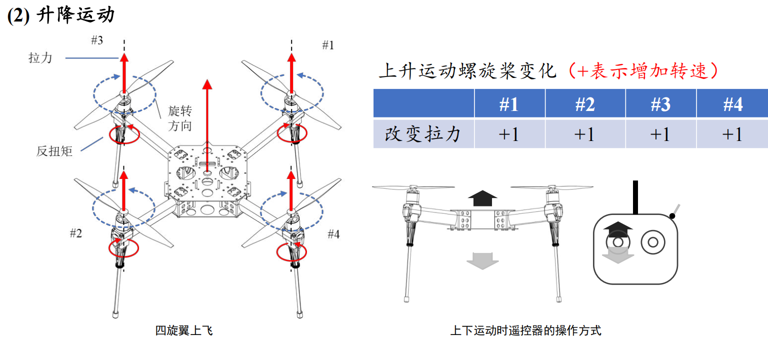 升降运动通过同步增加或减小四个螺旋桨的转速实现,上飞时所有螺旋桨转速均增加。