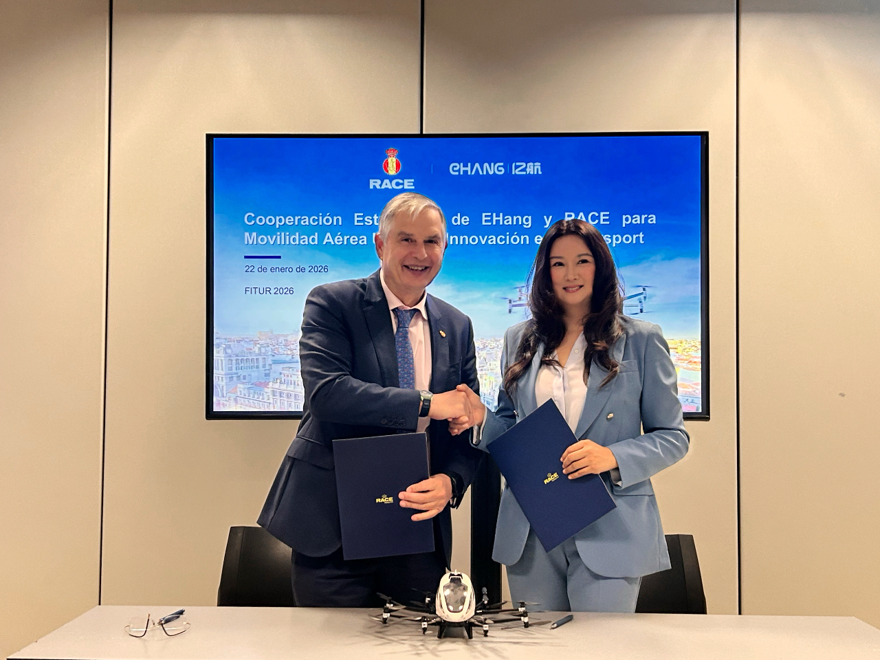 此次签约仪式在 2026 年马德里国际旅游交易会期间举行,亿航智能欧洲及拉丁美洲首席运营官向静,与 RACE 及 RACE 基金会主席、国际汽车联合会参议院主席 Carmelo Sanz de Barros 共同签署协议。西班牙马德里自治区交通与出行总局局长 Luis Miguel Torres 出席并见证签约,RACE 首席执行官兼国际汽车联合会欧洲 / 非洲 / 中东区主席 Jorge F. Delgado 等多位代表也到场参与。